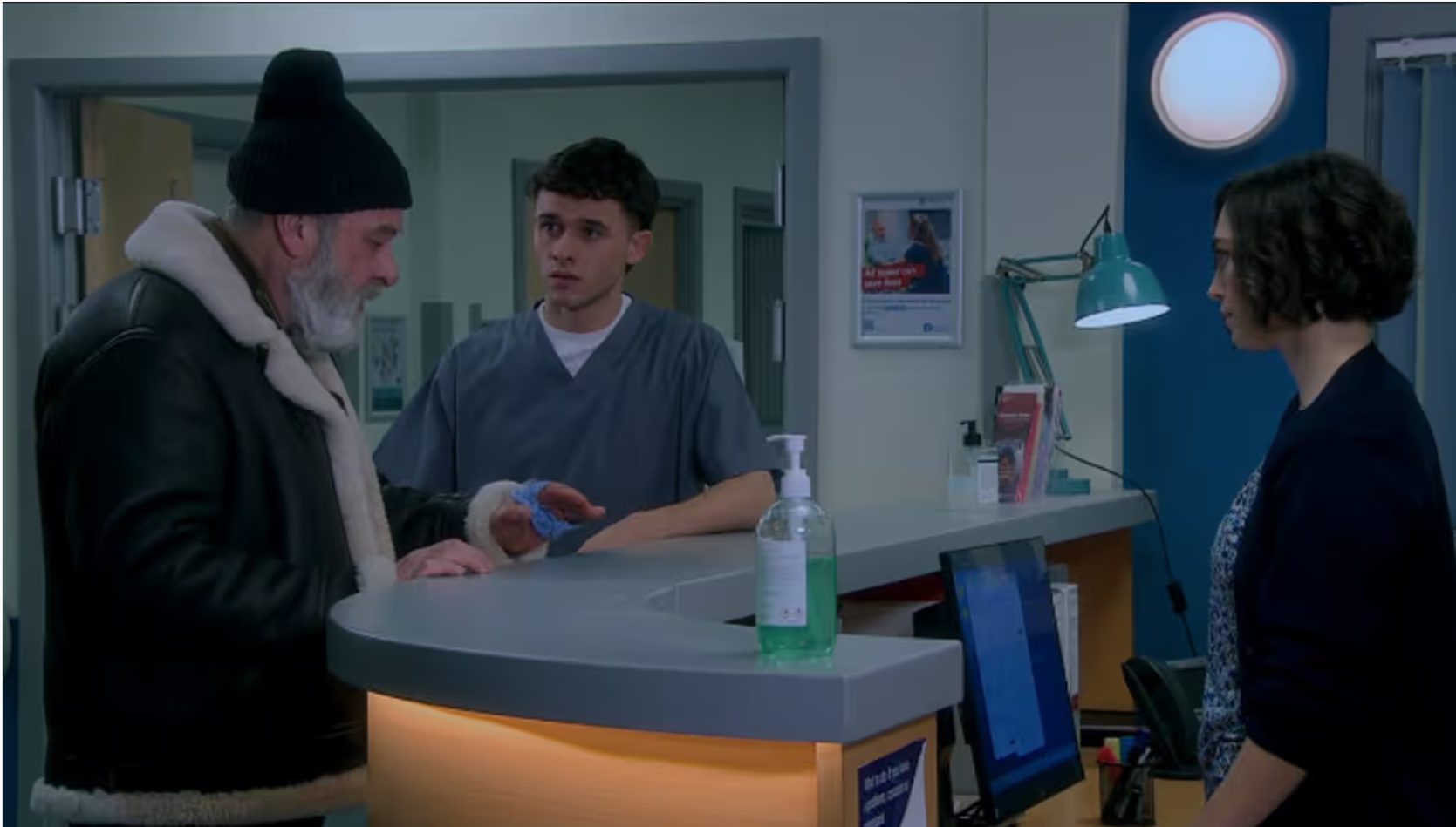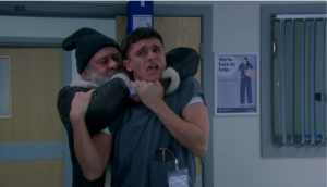 He grew increasingly impatient and student doctor Jacob Gallagher (Joe-Warren Plant) pulled him into a side room to try and give some immediate care to his hand.