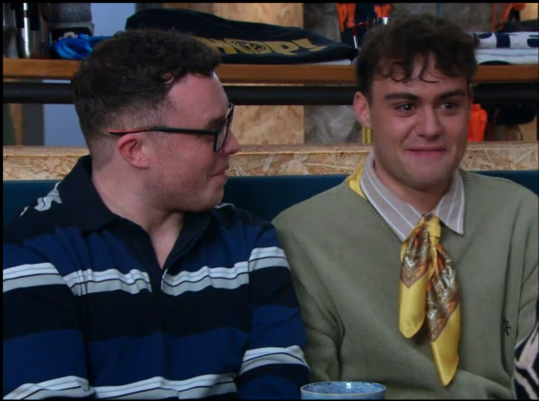 On Thursday Vinny Dingle (Bradley Johnson) and Lewis Barton (Bradley Riches) confirmed their romance in a conversation with Vinny’s mother Mandy (Lisa Riley) at The Hop.