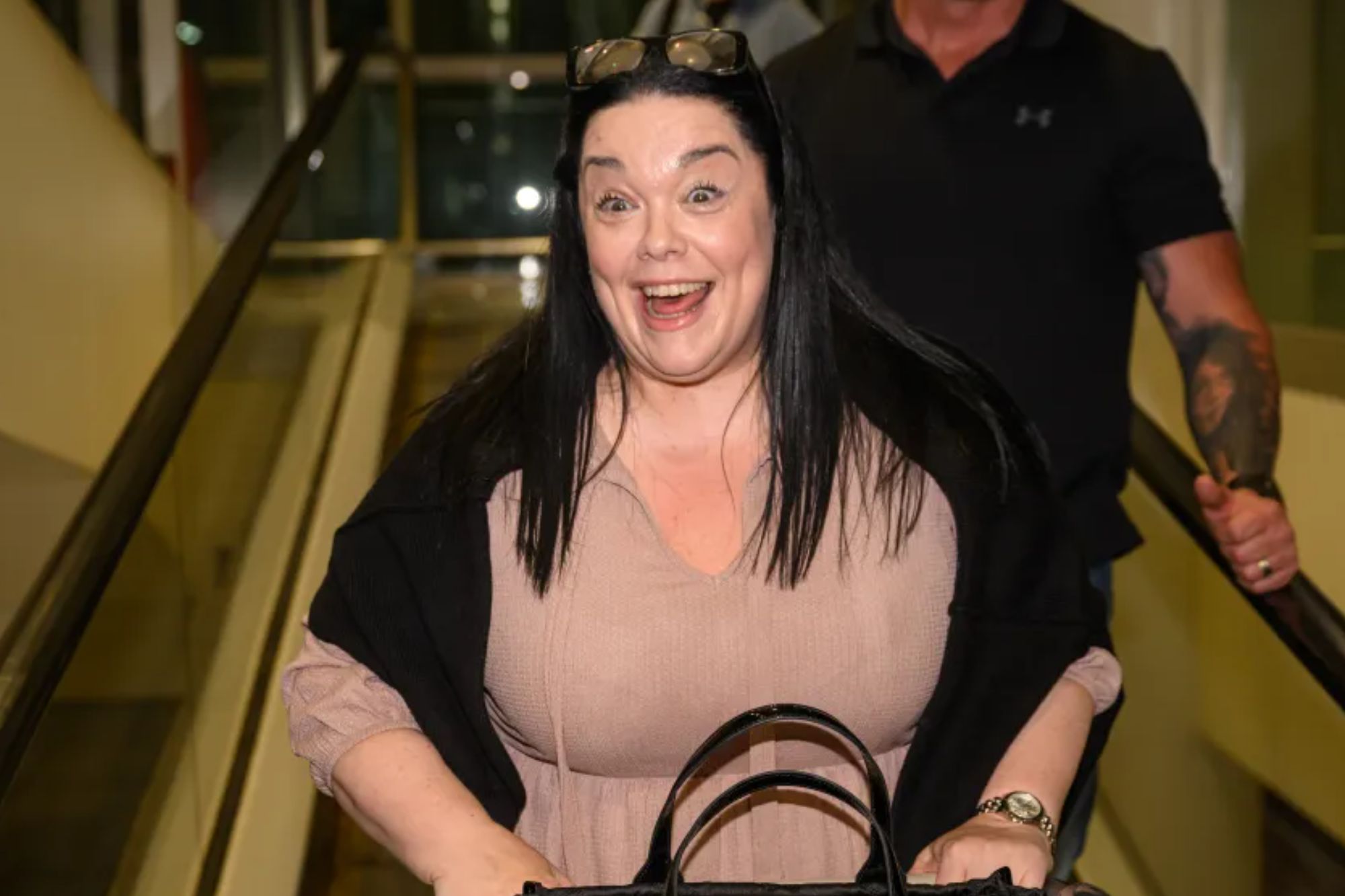 The actress, who plays Mandy Dingle on the ITV soap, flashed a big smile as she strolled through Brisbane Airport on Sunday.